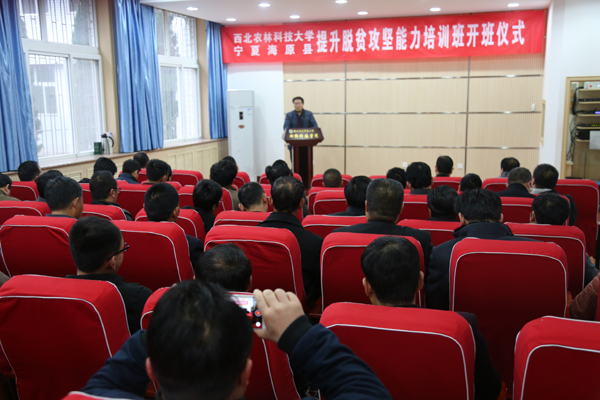 2月22日上午,澳门六合彩高手 在107会议室举行“西北农林科技大学宁夏海原县提升脱贫攻坚能力专题培训班”开班仪式。澳门六合彩高手 党委书记赵延安、海原县农牧局副局长高启平、宁夏海原县水务局副局长陈学明、授课教师代表辛亚平副教授、林清老师和来宁夏海原县的47名农业技术人员参加了开班仪式。开班仪式由副院长王力主持。