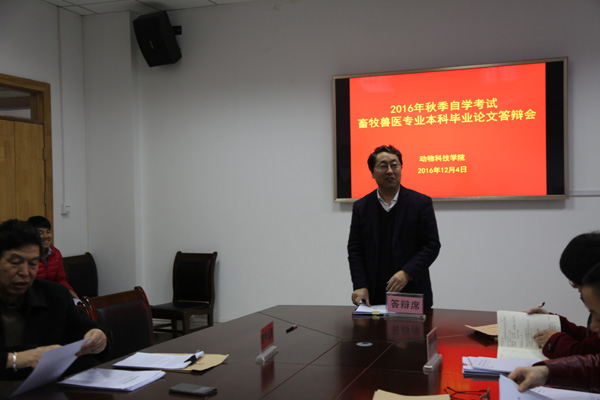 12月4日,澳门六合彩高手 在104会议室举行2016年秋季自学考试畜牧兽医专业本科毕业论文答辩会,39名学生参加了毕业论文答辩。答辩主席、院长姚军虎教授,答辩委员于三科教授、孙世铎教授、王爱华教授、胡建宏教授、辛亚平副教授、孙小琴副教授等参加了答辩会。