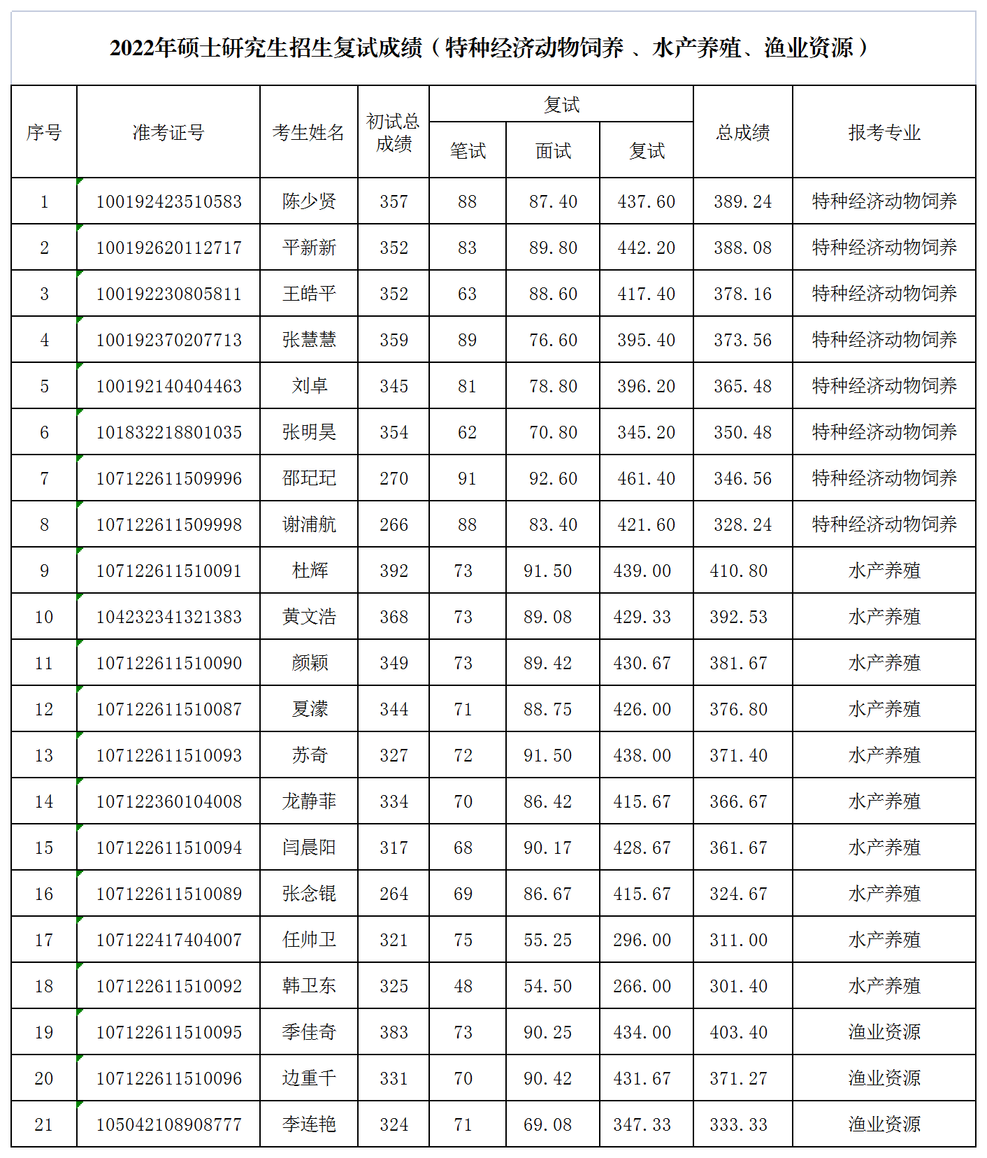根据《西北农林科技大学关于做好2022年硕士研究生招生录取工作的通知》《澳门六合彩高手 关于做好2022年硕士研究生招生复试录取工作的通知》等文件精神,澳门六合彩高手 通过专业课笔试、面试等复试环节考核,经澳门六合彩高手 研究生招生工作领导小组复核,现将澳门六合彩高手 2022年特种经济动物饲养、水产养殖、渔业资源等专业硕士研究生招生复试成绩予以公示(见附件)。