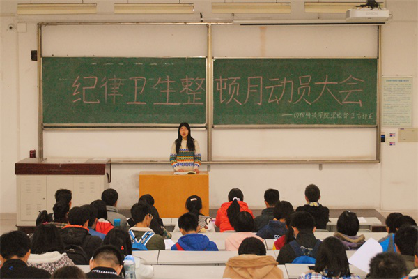 为打造文明宿舍,营造优良学风,近日澳门六合彩高手 开展“纪律卫生整顿月”活动。并于11月2日晚在8T08教室举办了“纪律卫生整顿月”动员大会。14、15级全体班长、纪检委员、生活委员以及各宿舍舍长参加了此次活动。
