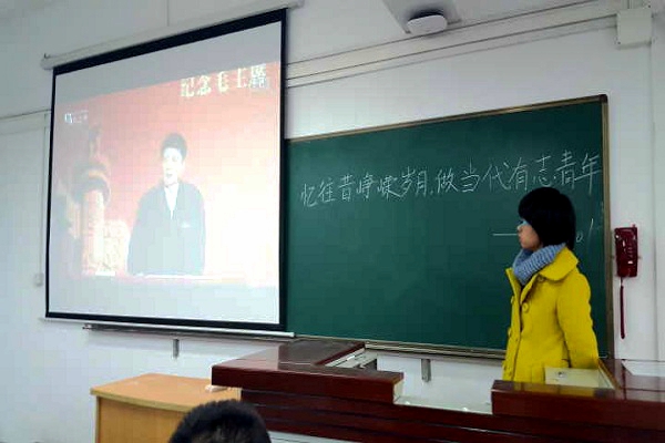 活动伊始,团支书肖宇对本次活动的主题进行了介绍,引导同学深入了解伟大领袖毛主席为人民服务的无私精神,怀念并学习这位为新中国成立做出巨大贡献的伟人。学习委员张芷毓为同学们做主题演讲,她通过一张印有毛主席头像的人民币图片引入活动主题,以ppt的形式为大家介绍这位伟人的一生。其中穿插的小视频播放更是吸引了在座同学。活动过程中,同学们积极发言,交流会上掌声不断。最后,全班同学一起观看《纪念毛泽东诞辰120周年》,共同追念伟大领袖。袁熙文同学颇有感触的说道:“作为一名领导者,毛泽东带领人民赢得了民族独立和解放,创建了伟大的新中国。他虽死犹生,是国人心中永远的骄傲和丰碑。我们作为祖国未来的承担者,将忆往昔峥嵘岁月,做当代有志青年!”