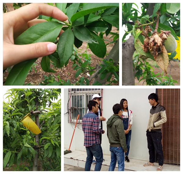 在与赵先生的交流中,我们了解到这个季节正是桃病害的高发期,而在基地内发现最为频繁的是蚜虫病。蚜虫以卵在桃树枝条腋芽间、裂缝处越冬,在早春桃芽萌发时,卵开始孵化,桃瘤蚜于五月上旬开始危害,六月七月大危害。基地所采取喷洒农药以及粘贴捕虫板的方式应对,但效果不佳。