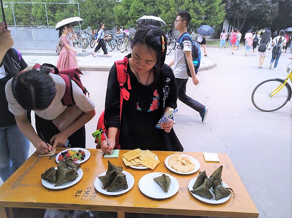 从春秋战国至今,端午节已在民间传承两千多年,各地的端午节过法虽不尽相同,但包粽子、划龙船是普遍习俗。本次活动吸引了众多同学前往现场品尝不同口味的粽子:甜枣粽、豆沙粽、咸肉粽等各式粽子应有尽有,来自五湖四海的同学们聚在一起,一边品尝美味可口的粽子,一边交流自己家乡的传统习俗,共话佳节。值得一提的是,活动还先后收集了共五十余名同学关于“我的家乡端午节习俗”和“我最爱的粽子”等趣味问题的各类答复,唤醒根植在中华儿女内心的传统味蕾和祖辈相传的民俗记忆。活动现场洋溢着欢乐融洽的节日氛围,参与活动的同学们纷纷表示,会肩负起炎黄子孙“不忘本、重传承”的历史使命,进一步传承中国传统文化。