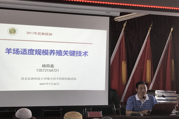 杨雨鑫老师参与了西北农林科技大学绒山羊科研创新,有着丰富的实践经验。他通过对比陕西榆林与当地的自然条件,将陕西榆林家庭适度规模养殖的经验介绍给当地的农户。首先他从羊产业发展的基础与方向介绍了羊产业发展的特征、布局和发展理念,并从品种利用、关键技术、经营管理、市场价格等方面的问题做了说明,指出目前来说适度规模家庭羊场养种一体化经营前景广阔,适合农户发展。同时他也对适度规模家庭羊场养种一体化经营做了详细介绍,这种养殖模式有六大特点:1.家庭养种循环系统2.为养而种,引进良种饲草3.为养而种,水肥配套4.机械配套,草料加工5.家庭养殖,棚圈配套6.农户育种,对羔母羊。