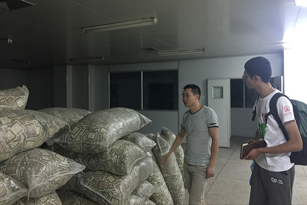 参观完原茶加工车间后,队员们依次前往发酵车间、成品包装车间和陈列室,进行参观考察。在这期间,队员们进一步了解了茶叶的加工工艺,并观摩了从上世纪90年代一直到现代在售的产品。吴经理告诉大家:真正的万应茶制作工艺一直掌握在灵源寺的僧人手中,文化大革命期间,灵源寺僧人们纷纷还俗后将这门技艺教授给了附近灵水村村民,而后成立了制茶厂,现在这门技艺在这里已经被非常好的传承了下来。掌握了这些情况之后,队员们感触很深,纷纷表示非常荣幸能够见证这一古老技艺的发扬光大。
