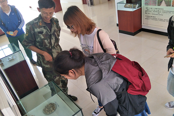 迈进博物馆,队员们立刻被满目的文化宝物深深吸引:博物馆内陈列有民族、民俗展馆,临时陈列有石器时代陈列、岩画陈列、青铜文化陈列、铜鼓文化陈列和革命历史陈列引得大家纷纷驻足欣赏,一行人沉醉在厚重的文化气息中。在博物馆讲解员的介绍下,队员们了解到,文山州在旧石器时代就有人类活动的痕迹,在当地发现大量的岩画、化石和石器充分体现了早起人类的智慧。讲解员还向大家展示了文山独具特色的铜鼓,她讲解道:“铜鼓作为文山地区少数民族具有代表性的历史文物,不但使用历史十分悠久,而且分布广、数量大、类型齐全。”