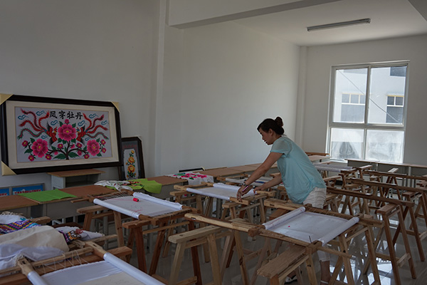 随后,我们参观了小规模刺绣车间,一部分女工正用缝纫机制作背包、挂件等实用物品,做好后,拿给另一边的绣工,绣女们用自己高超的技艺在这些物件上秀出适合个种年龄人的图案,最后经过处理便可上市。与传统框绣不一样的是,这种小物件的销售量更大,市场更广,王小琴正是利用了这一点,在传承上适当创新,既保留了手工羌绣的纯美,又开拓了市场,使得自己离巾帼脱贫梦更近一步。