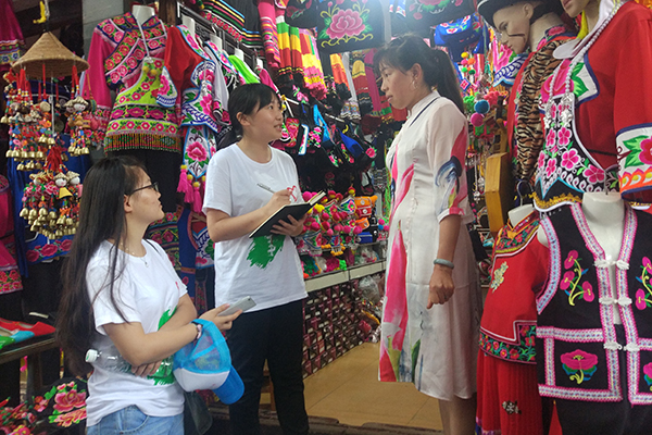 走进“彝人古镇”,最先入目是仿古式的建筑和在云南大多数地方一样见到的珠宝店,然而这些仿古建筑却并没有表现出任何与其他地区古镇的区别。“在这里给我的第一个观念就是,这就是一个商业区,像是重庆的观音桥和昆明的南屏街一样。”队长杨宸表示。通过走访调研,队员们采访了多名店主,队员们了解到,在这里的店主对于古镇并没有特殊的情感,在他们看来这里就是一片商业区。