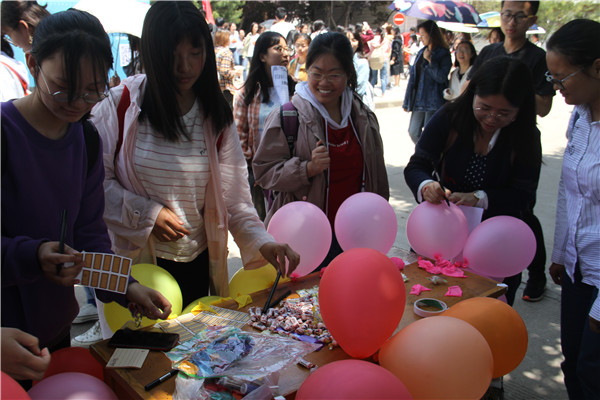 活动前夕,为了解同学们的心理状况,内心困惑,压力来源等,更有效地舒缓同学们的心理压力,心理健康部部委采于五月五日晚自习在八教为同学们分发便签,让同学们将自己的烦恼困惑写下来,并让想收到回复的同学留下联系方式。通过短信、QQ等方式对心理存在困惑的同学们进行认真诚挚的回复,借此帮助同学们清理“心灵毒素”,解决他们的烦恼,接纳“心灵给养”。活动当天,精美有趣的展板和部委们热情地讲解,将烦恼写在气球上并扎破的活动方式吸引了过往同学纷纷驻足,通过扎破写着自己烦恼的气球的方式来宣泄内心积蓄已久的情绪,然后送给自己一句治愈的话,赶走自己的心灵毒素。动科1806班伍静昀同学感慨:“最近训练和学习让我疲惫不堪,感谢心理健康部的这次活动,让我宣泄了自己的情绪。”