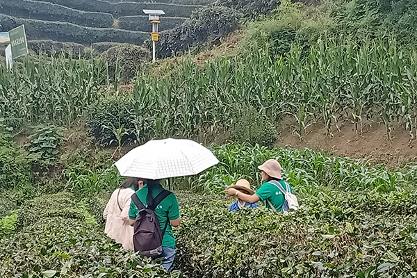拜访镇长的当天,镇长还让队员们参观了罗帐岭茶庄,虽然已经过了采摘茶叶的季节,但是茶庄仍留有茶叶的清香,雨后空气中散发的泥土的味道与茶香混合在一起,令人回味。脱贫攻坚工作开展以来,此处将茶叶产业,观光农业与健康扶贫疾控八大行动有机结合,先后修建了生态旅游观光步道,展现了茶叶生产工艺,彩色壁画和教育宣传。胡锦涛主席曾经来此茶园进行考察,并提出了相关的建设性意见,它对农业经济的发展有极大帮助。在那里队员们和一位修剪茶树的老奶奶进行了交流,从中了解到现在的茶园主要负责植茶、种茶、修茶,一方面给旅客旅游观光,另一方面进行相关售卖,预期准备修建茶坊来做茶。