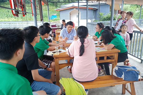 为了更加深入地了解网红基地的建设和未来的发展成效,团队一行人与网红基地的负责人进行了热情的交流与提问。在此交谈过程中,项目负责人着重诠释了喜神谷网红基地生态农业项目的愿景规划,喜神谷喜文化的传播社会影响力及创收预判,项目在建期间产生的社会效益及营运后产生的行业影响,以从根本上带动属地村民脱贫致富就地务工创业为初心的践行概况和实践过程,并全面概述了目前项目创建过程中面临和存在的实际问题,队员们从中了解到了这里对交通状况的改善和即将要建设的景点如观光缆车,天然心池,十里银杏,山间渔猎,野外采摘,儿童乐园,康养中心,各民族特色民宿等,深入地了解了它的建设目的是以网红基地为一个接待中心,为不同游客提供休闲娱乐的活动空间,在体验乡村特色,民俗风情的同时,感受到历史古风气息,与现代化特色相结合的美丽景区,并融入农业种植,渔猎采摘,养殖发展,和各样的民族特色,并期待以影视来彰显西沟魅力;建设意义是要引进特色资源,种植特色作物,在带动西沟村农业,养殖业,林业发展的同时,不断创新发展,以周围贫困户为劳动力,为他们提供工作岗位,从而达到扶贫攻坚、振兴乡村的最终目的;建设问题有政府的资金支持,农户与旅游业发展之间的土地流转问题协商,以及之后的网络传销宣传等。
