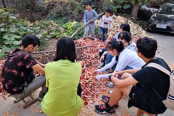 队员们一起剥玉米
