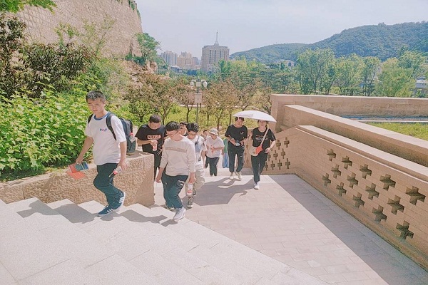 队员们从延河大桥出发,绕着山脚去参观宝塔山脚下的摩崖石刻,其中多副题字为抗战时期所留。随后队员们登至山腰处,参观了红军抗战时期驻扎留下的窑洞,其中挂着许多珍贵的照片,队员们都认真地进行观看和学习。登至山顶,山顶宝塔旁边挂着一口铜钟,有石碑介绍道:中共中央在延安时,曾以此铜钟报时、报警。参观完宝塔山顶后,队员们集体在宝塔前合影留念。而后沿着下山步道下山,结束对宝塔山的参观寻访。