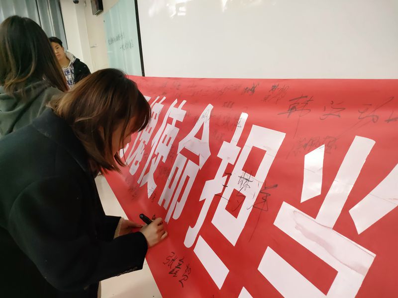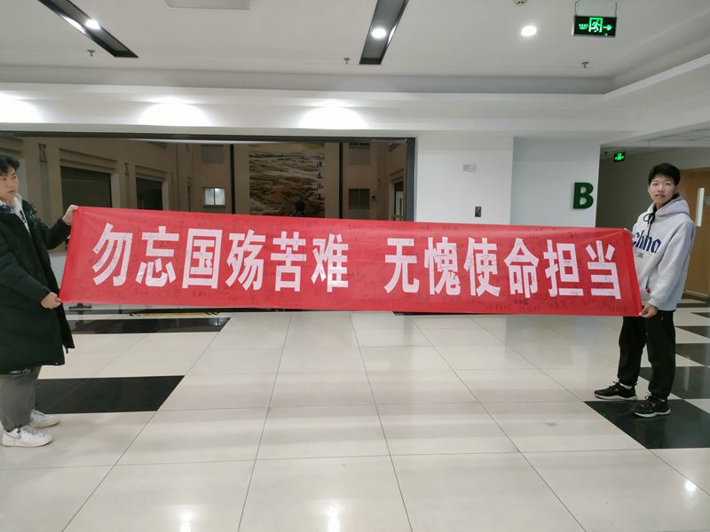 听到这不绝的声声怒吼,同学们握紧双拳,攥着笔,坚定地在“勿忘国殇苦难,无愧使命担当”的横幅上签下了自己的名字,并将民族复兴的铮铮誓言,深深地铭刻在自己的心中。