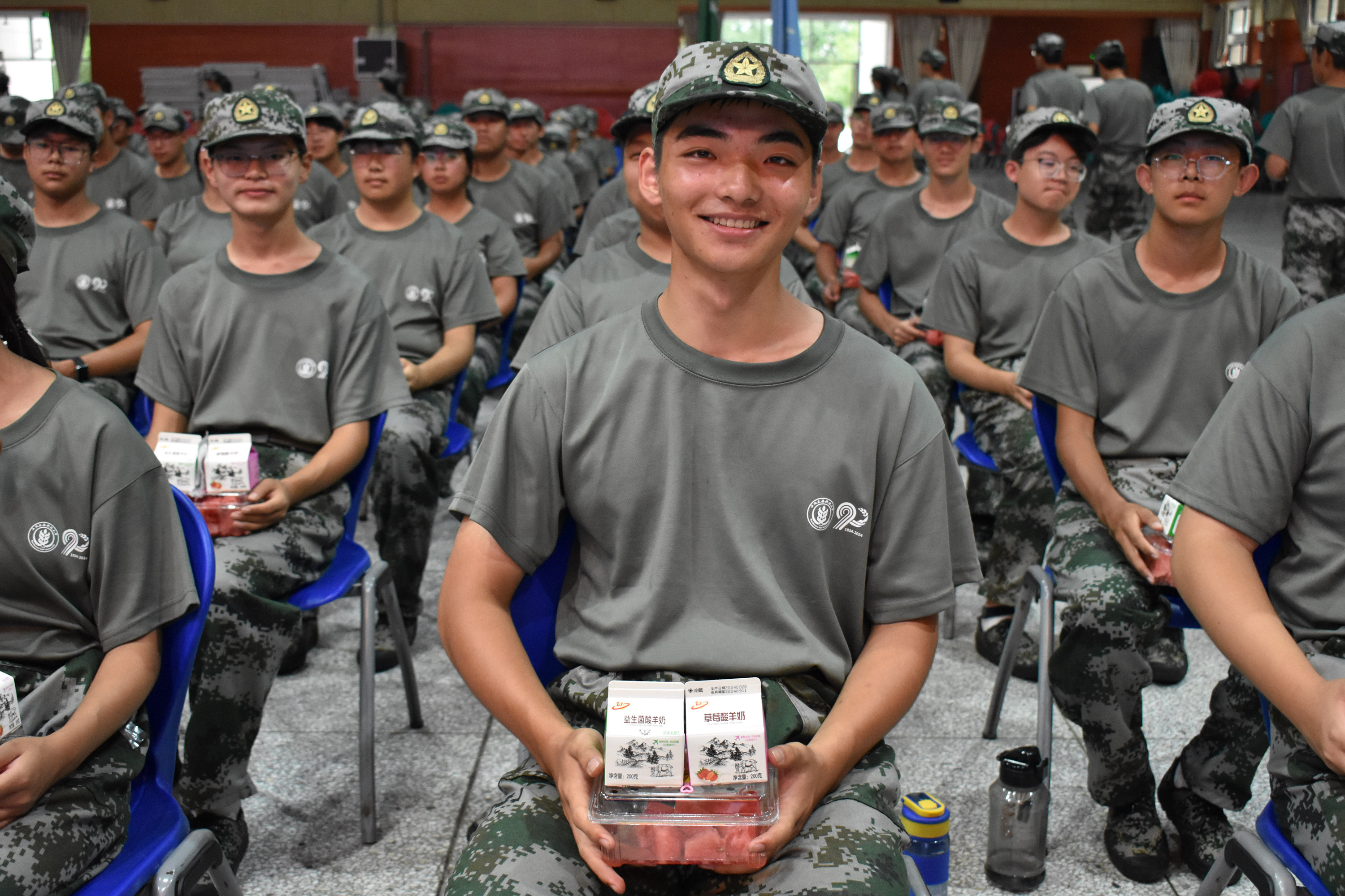 歌声嘹亮、动作整齐、气势恢宏,军训场上澳门六合彩高手 2024级本科生正在展开合唱比赛和军事技能比武的排练。为了抓好入学第一课,同时给动科学子加油打气,让同学们品味畜牧科技产品,体验动科行业魅力,9月2日下午,澳门六合彩高手 党委书记曹军会,宋宇轩研究员,任战军教授,党委副书记王力带着益生菌酸羊奶、麻辣兔丁和冰镇西瓜来到北绣山活动中心慰问全体承训教官和参训学生。