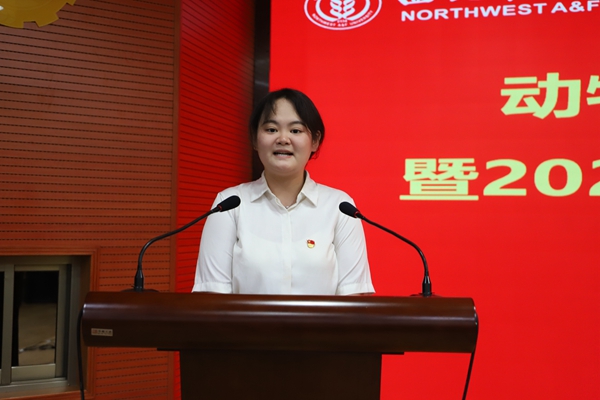 优秀党务工作者、教工第四党支部宣传委员任周正同志和优秀共产党员、研究生第十二党支部刘瑞同志分别上台发言,围绕青年教师成长、党建与业务融合以及青年学生如何在新时代挺膺担当等,表达了为畜牧学一流学科建设贡献力量的决心和信心。随后全体党员重温入党誓词,副院长凌飞同志领誓。