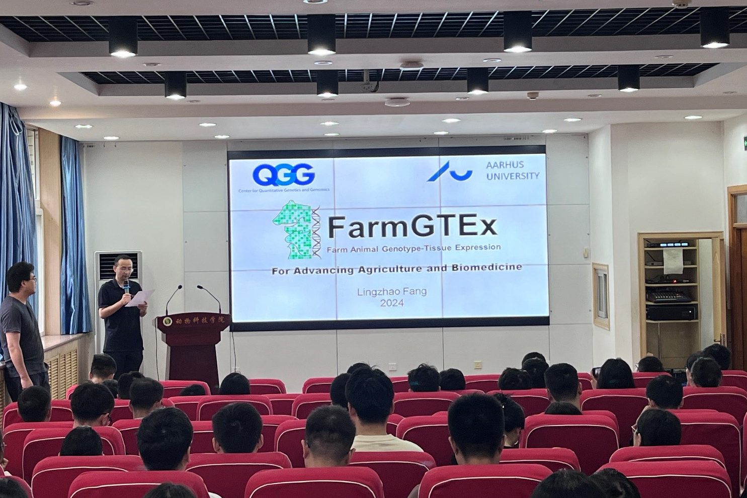 丹麦奥胡斯大学房灵昭博士先后做了2场FarmGTEx系列报告,分别从数据的采集与分析、基因表达调控机制、跨物种基因功能比较等热点话题方面详细介绍了FarmGTEx项目的总体进展与未来规划,并对CattleGTEx、PigGTEx、ChickenGTEx和Sheep&GoatGTEx进行项目介绍和进展报告。报告会内容丰富精彩,引人入胜。在随后的学术交流和提问环节中,房灵昭博士与参会师生就报告内容进行了深入的讨论和交流。大家纷纷表示,通过此次报告会,不仅加深了对FarmGTEx项目的理解,也拓宽了研究思路,激发了新的研究灵感。