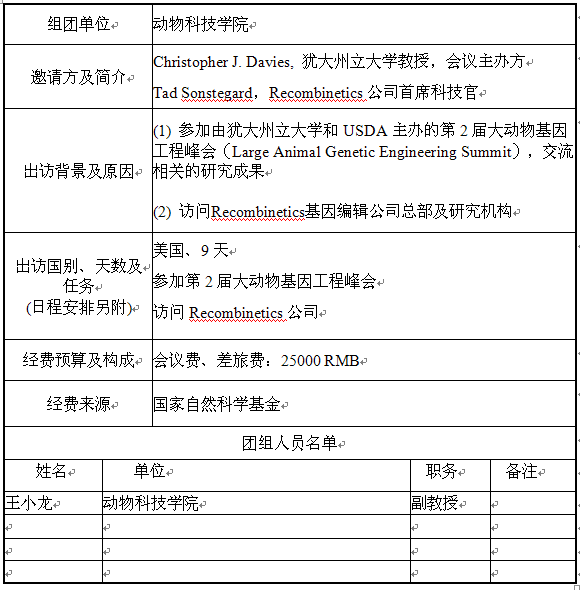 现将澳门六合彩高手 王小龙副教授因公临时出国公示如下表: