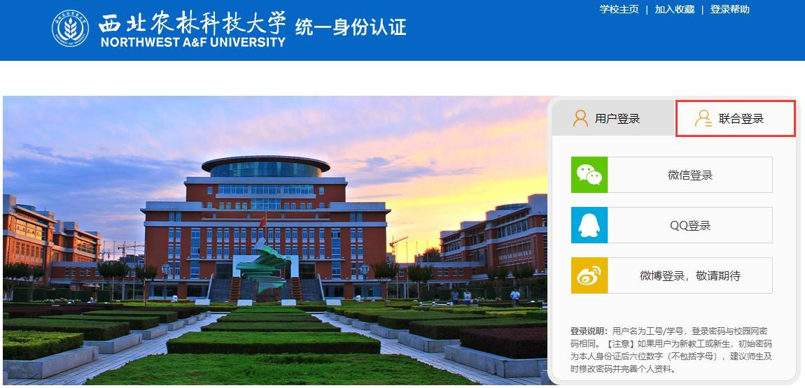 进入西北农林科技大学信息综合服务平台(//ehall.macaulhcgs.com),点击页面中间或页面右上角的登录按钮。随后,跳转到统一身份认证页面,默认是学工号和密码登录的方式,点击如图“联合登录”的按钮。