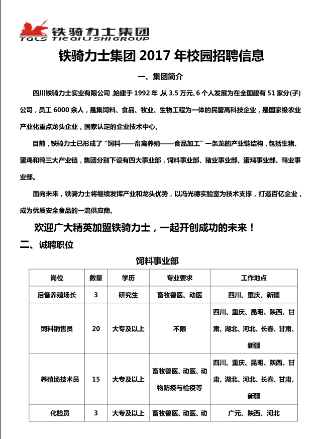 铁骑力士集团 2017 年校园招聘信息