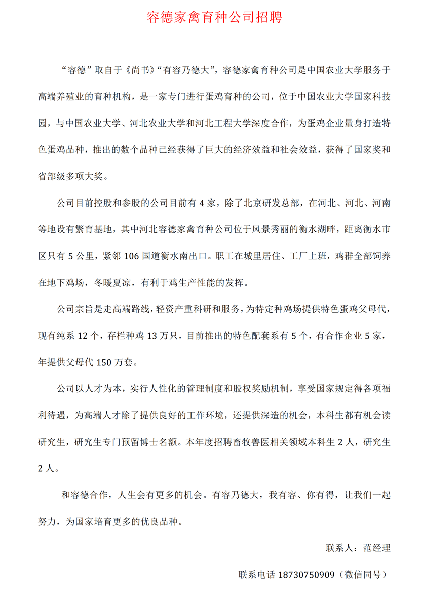 您现在的位置: 主页» 学生管理» 就业信息» 河北容德家禽育种公司招聘信息