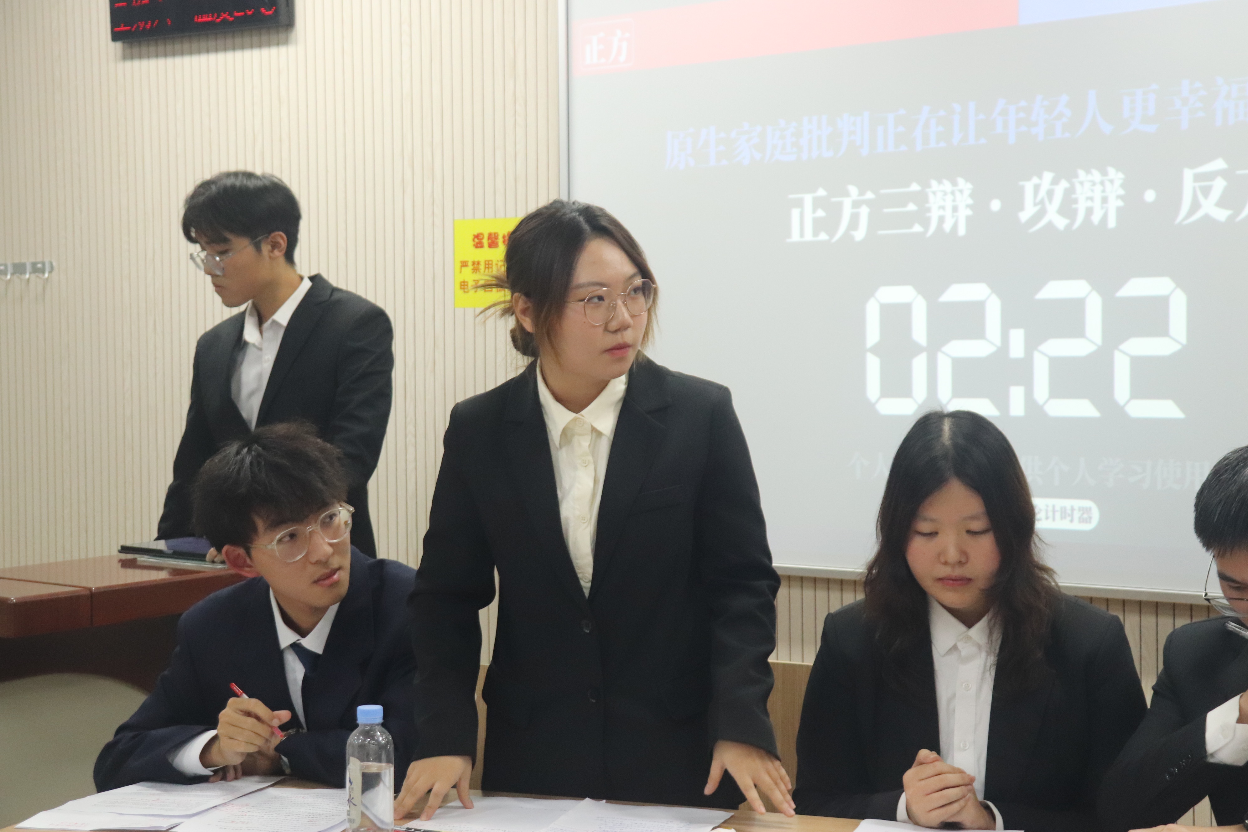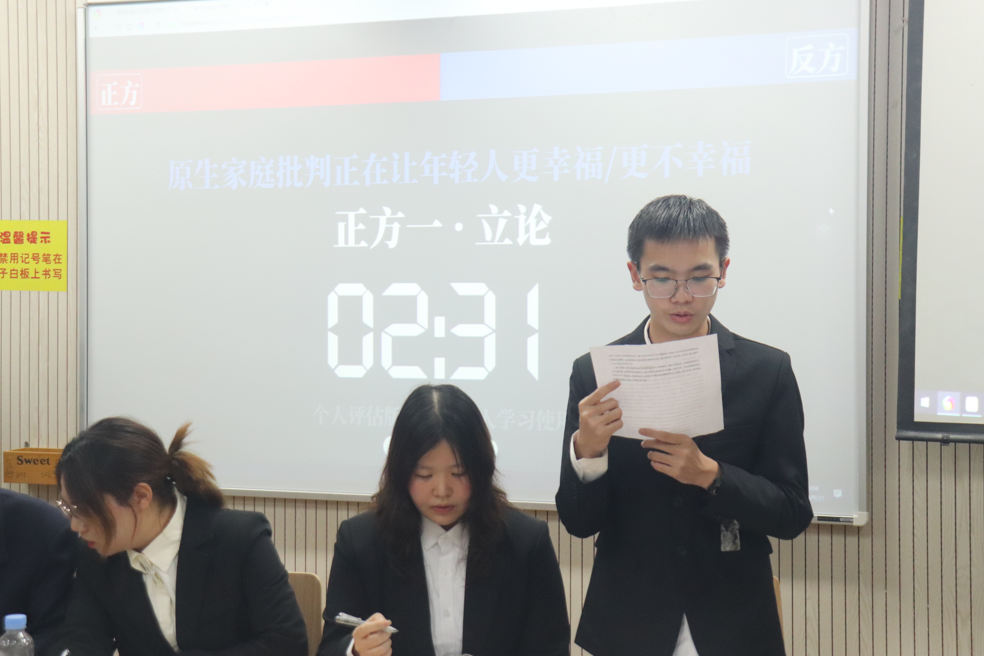 比赛伊始,正方一辩以犀利的言辞开篇立论,指出原生家庭批判能让年轻人正视家庭问题根源,通过宣泄与反思从而获得成长,进而提升幸福感。反方一辩则沉稳回应,强调过度的原生家庭批判易使年轻人陷入消极情绪泥沼,忽视自身主观能动性,导致幸福感降低。