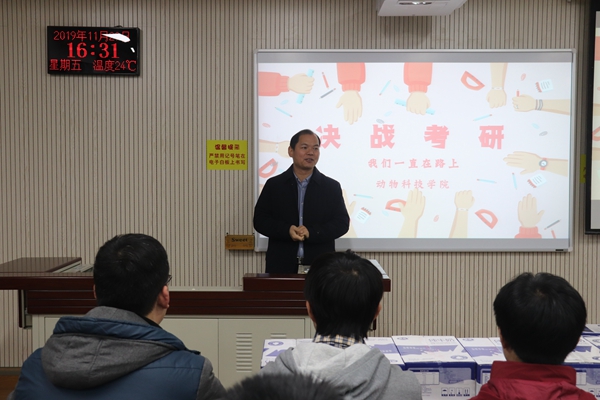 曹书记首先对同学们积极准备,勤奋复习的状态给予了肯定和赞扬,并对考研同学提出了三点要求:第一,幸福生活是奋斗出来的,曹书记指出本硕博就业的门槛是截然不同的,社会越来越需要更高层次的人才,只有努力奋斗才能全面提升自己的素质和能力;第二,青年学子当立鸿鹄之志,曹书记从自身的经历出发讲到,支撑人民身体健康的肉蛋奶在几十年前是十分稀缺的,现如今随着畜牧业的发展,膳食结构的改善全面提升了我国人民的生活,所以考研也是在为了我国的畜牧业、脱贫攻坚、乡村振兴、经济发展战略作贡献,奉献自己的一份力量;第三,人生要放大自己的格局,开拓自己的视野,只有拥有大格局,才能有大成就,要把自己置于中华民族伟大复兴的中国梦的深度实践当中,要永远保持一颗中国心,学习既是为了我们自己的幸福生活,更是为了我们的国家和我们民族。