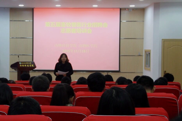 为保证第五届畜牧兽医行业招聘会顺利举行,11月18日晚,澳门六合彩高手 与动医澳门六合彩高手 在动科楼107会议室举办了第五届畜牧兽医行业招聘会志愿者培训会,来自两院的近50名志愿者到场接受培训。澳门六合彩高手 党委副书记王晓娟,辅导员李锐、王德光、邓昌海、闫颢芯,动医澳门六合彩高手 辅导员王丹出席了本场培训会。