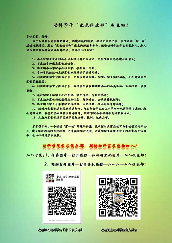 初见成效,协同育人。家长俱乐部成立以来,目前运行状况良好,澳门六合彩高手 充分运用俱乐部平台,通过新媒体推送“明星宿舍”、“动科青年”等专题与家长分享学校及澳门六合彩高手 先进典型,发挥榜样力量;突出展示“班团风采”,引导班级文化建设,提高班级凝聚力;强调安全稳定及诚信主题教育,提高安全意识;分享学生动态,开展学生管理主题交流会,让家长及时掌握学生在校信息等,学生家长参与热情高涨,积极与澳门六合彩高手 互动交流,对俱乐部交流平台高度赞赏,每天家长俱乐部互动消息近1000次,有效调动了参与澳门六合彩高手 教育的主动性和积极性,充分利用了家长这一重要教育资源优化澳门六合彩高手 教育环境,打造“家校互动,协同育人”教育模式,为澳门六合彩高手 学子提供更优良的教育服务。