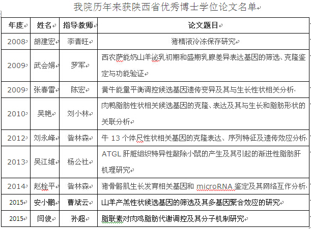 根据《陕西省优秀博士学位论文评选办法》(陕教位〔2013〕12号)和《关于做好2015年陕西省优秀博士学位论文评选工作的通知》(陕教位〔2015〕4号)要求,省教育厅、省学位委员会组织了2015年陕西省优秀博士学位论文的申报与评选工作。经申报推荐、通讯评议、专家评审、结果公示等程序,陕西省教育厅日前公布了获奖名单,澳门六合彩高手 曹斌云教授指导的2010级安小鹏博士的学位论文《山羊产羔性状候选基因的筛选及其多基因聚合效应的研究》和孙超教授指导的2009级闫俊博士的学位论文《脂联素对肉鸡脂肪代谢调控及其分子机制研究》入选,本次评出2015年陕西省优秀博士学位论文99篇,分别来自西安交通大学等省内17所高校,我校共有9篇论文入选。自2008年以来,澳门六合彩高手 共有9篇论文获陕西省优秀博士学位论文。