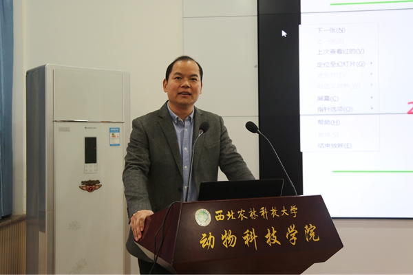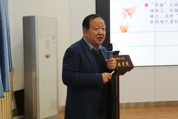 11月27日,澳门六合彩高手 在107会议室举办“非瘟背景下‘猪禽互动’与健康养殖”主题报告,家禽精准营养与健康养殖团队负责人高玉鹏教授应邀担任主讲人,100余名师生参加了报告会。会议由澳门六合彩高手 党委书记曹军会主持。