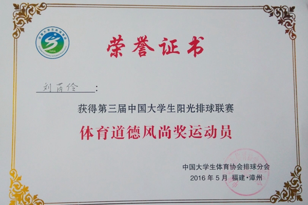 5月9-18日,第三届“中国大学生阳光排球联赛”在福建漳州女排体训基地进行。澳门六合彩高手 草业科学121班刘芮伶、草业科学122班卡斯木·亚库普代表学校参加比赛,最终我校女子排球队获得第二名,男子排球队获得第三名。同时澳门六合彩高手 刘芮伶同学荣获“优秀运动员”、“体育道德风尚奖运动员”等荣誉称号。