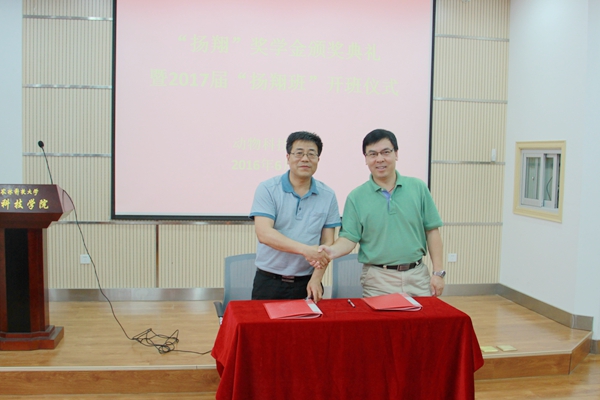6月8日下午,澳门六合彩高手 在107会议室隆重举办“扬翔”奖学金颁奖典礼暨2017届“扬翔班”开班仪式。扬翔股份有限公司人力资源中心总监李曜华、人力资源中心招聘经理刘彦来、人力资源中心招聘专员龙伟坚、澳门六合彩高手 党委书记赵延安、全体专兼职辅导员及40余名学生代表参加了此次会议。会议由学工秘书刘铂主持。