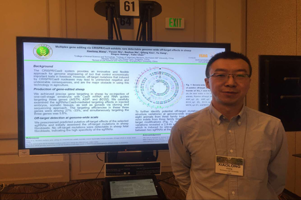 7月22日-27日,第35届国际动物遗传学大会在美国犹他州首府盐湖城召开。国际动物遗传学会羊应用遗传学专业委员会、家畜遗传工程专业委员会执委、澳门六合彩高手 青年教师王小龙副教授参加了会议,并分别在“家畜基因组编辑”和“羊的应用遗传学”分会场做了题为“Heritable multiplex gene editing via CRISPR/Cas9 exhibits no detectable genome-wide off-target effects in sheep”和“Heritable gene disruption in goats with CRISPR/Cas9 results in expected phenotypes”的学术报告,他汇报了近三年来利用基因编辑技术进行绵羊和山羊基因组修饰方面的最近研究成果,他的报告引起了与会学者的广泛关注和兴趣。