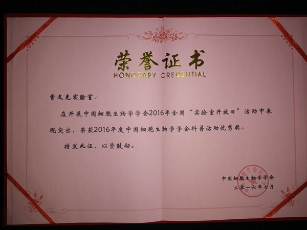 近日,澳门六合彩高手 曾文先教授团队荣获2016年度中国细胞生物学学会科普活动优秀奖。2015-2016学年,曾文先教授团队举办多项科普公益活动,反响热烈,受到了陕西传媒网,西安光明网,陕西细胞生物学会官网等6家媒体的广泛报道。为鼓励澳门六合彩高手 师生积极参与科普工作,澳门六合彩高手 党委书记赵延安同志,亲自为组织人员书写科普工作者奖状。
