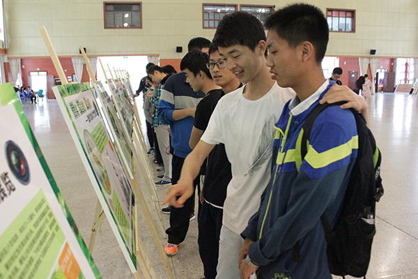 学生兴致勃勃观看鸟类摄影展