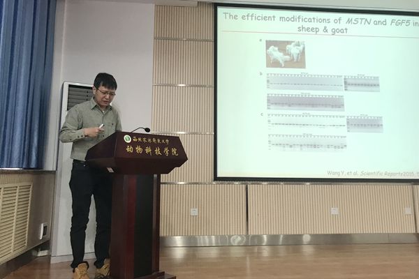黄行许教授首先详细介绍了ZFN、TALEN、CRISPR/Cas9三种主要的基因组编辑技术的发展历程及优缺点。重点介绍了其团队联合我校及国内外其它合作单位,利用CRISPR/Cas9技术在农业动物和生物医学动物模型构建上的多个成功案例,展示了CRISPR/Cas9技术广阔的应用前景,报告内容引起了师生广泛的兴趣,报告结束后现场师生与黄行许教授就自己关注的问题进行了互动交流。