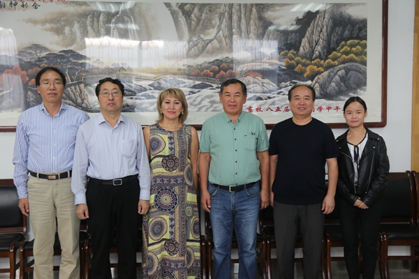 与北哈萨克斯坦动物与作物研究所Ayup Iskakov所长(右三)、国立大学农澳门六合彩高手 院长Altyn Shayakhmetova教授(左三)合影