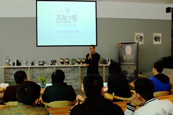 在第一环节“把我的小羊讲给你听”中,安志文先生从创新创业意识展开,就自身创业历程进行生动细致的讲解。期间,他为同学们带来了产自自家公司的羊肉产品。羊肉飘香兴致高,伴着美味佳肴,同学们认真聆听安先生讲述成立公司“小黑家”的创业故事。