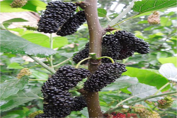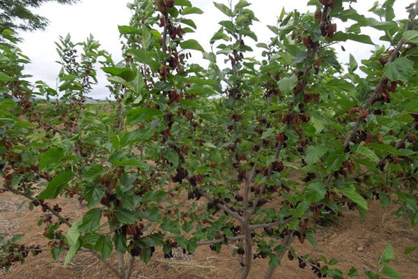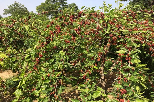 红果2号是苏超研究员带领团队科研人员采用辐射诱变育种技术培育而成的果桑新品种。该品种具有生长旺盛,树型直立紧凑;枝条直立性好,皮青褐色,节间较短;叶卵圆形,深绿色,叶面光滑有光泽。花芽率99.2%,坐果率85%。成熟桑椹紫黑色,果长3.64cm、果径1.35cm、单果重3.2g。亩产鲜果2400kg。果实酸甜爽口,鲜果Vc以及Fe 、Ca 、Zn 等微量元素含量高,品质优良。是一个适应性广,抗逆性较强,鲜食和加工兼用果桑品种。红果2号1987年以广东桑品种“伦教408”为亲本,在桑芽萌动时采用60Co-γ射线照射枝条,其后进行单芽嫁接,从中选出优良的变异单株并繁育无性株系,1990-1995年完成品种对比试验,2016年完成多点区域试验。目前已在全国有20多个省(区)引进和示范种植,效果良好。