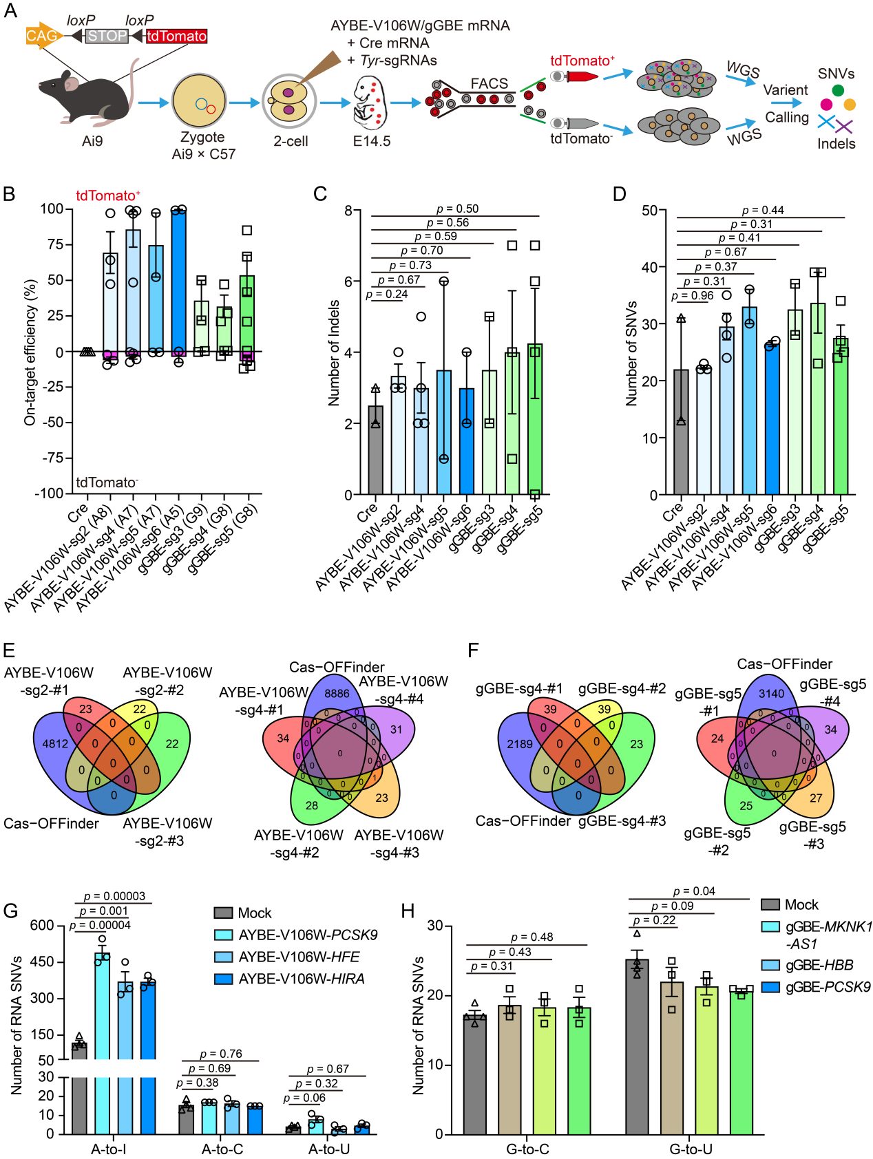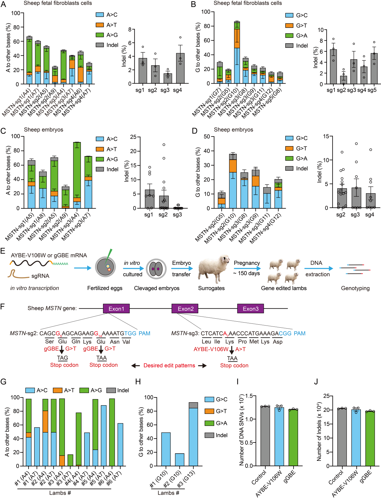 图2 AYBE和gGBE在绵羊胎儿成纤维细胞和绵羊胚胎上实现了安全高效碱基编辑