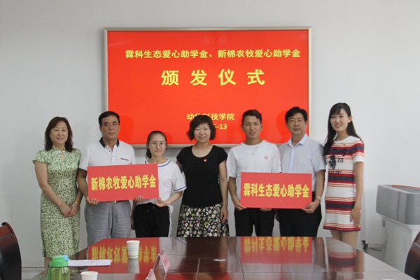 霖科生态爱心助学金、新棉农牧爱心助学金分别由陕西省杨凌霖科生态工程有限公司和陕西省杨凌新棉农牧有限公司设立,评选对象是新疆、西藏籍品学兼优、家庭经济条件困难的少数民族学生,助学金额为每人每年5000元。企业爱心助学金是院企密切合作的产物,旨在帮助贫困少数民族学生解决后顾之忧,自信坚毅完成学业。经过层层遴选,动科1602班欧珠加措同学和草业1601班孜白旦·亚力买买提同学获得资助。
