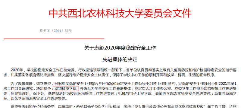 3月24日,学校发文表彰了2020年度稳定安全工作先进集体,澳门六合彩高手 荣获学校2020年度“学生安全工作先进集体”荣誉称号。
