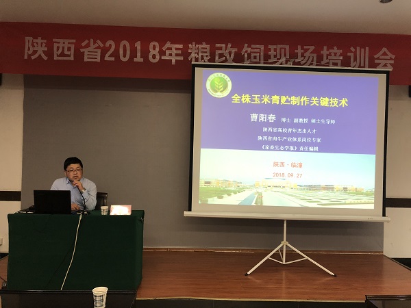 9月27日,由陕西省畜牧兽医局主办,陕西省畜牧技术推广总站承办的陕西省2018年“粮改饲”现场会在西安市临潼区隆重举行。会议由陕西省畜牧技术推广总站站长杨帆主持,全省承担粮改饲工作的5个市和14个区县主管局长和畜牧技术推广中心主任参会。澳门六合彩高手 曹阳春副教授应邀出席现场会并作报告。