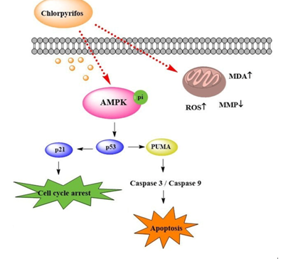 农药是现代农业生产中农作物稳产、高产的保障;与此同时,农药残留对人类健康带来很多负面影响,其对生殖的影响也越来越引起人们的重视。毒死蜱作为一种广泛使用的有机磷农药,不仅能使神经递质在神经突触累积,从而破坏了正常的神经传导;还具有一定的生殖毒性,但其在雄性生殖毒性上的研究还有待深入。该研究通过流式细胞术, Western Blot, TUNEL等实验技术,利用小鼠B型精原细胞系(GC-1 spg)、支持细胞系(TM4)及睾丸间质细胞系(TM3),发现毒死蜱可促进AMPK磷酸化,降低线粒体膜电位,上调细胞中ROS和MDA的水平,进而促进细胞的凋亡;同时诱导细胞周期阻滞。体内试验表明,毒死蜱可下调亲代和子一代小鼠睾丸、脾脏和肺脏中类固醇激素合成相关基因的表达。同时也发现槲皮素、根皮素、儿茶素和维生素C均可降低毒死蜱处理的GC-1 spg细胞中Caspase3,Caspase9 的表达,提示这四种活性物质具有一定的解毒作用。