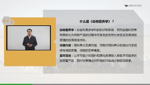 “动物营养学”是动物科学专业的专业基础课程,2006年入选陕西省精品课程,2010年入选教育部精品视频公开课。2016年起,该课程教学团队根据学科和畜牧产业的发展趋势及需求,以“问题式、模块化”教学理念为引导,对课程内容进行了系统梳理与编辑,凝练制作了11章共34小节的MOOC课程,从基本概念、行业热点、研究分析方法、消化吸收生理、三大营养物质、维生素及矿物质营养、营养标准等方面进行了全面讲解,阐明了动物摄入和利用饲料中营养物质过程与生命活动的关系,揭示了动物利用营养物质的量变质变规律。