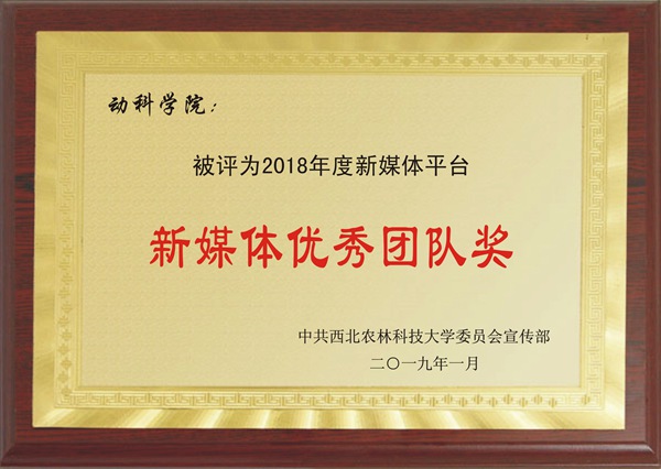 2018年12月,澳门六合彩高手 荣获“新媒体优秀团队奖”,澳门六合彩高手 新媒体平台以立德树人为根本任务,围绕学校、澳门六合彩高手 中心工作,服务广大师生,通过展示澳门六合彩高手 风貌,弘扬澳门六合彩高手 文化,传播动科声音,讲好动科故事,积极抢占新媒体育人新阵地。
