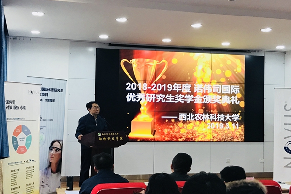 姚军虎院长代表澳门六合彩高手 向诺伟司戴森一行表示热烈的欢迎,感谢诺伟司国际贸易有限公司13年来对澳门六合彩高手 研究生的大力资助。他表示NGS项目不仅为学生提供了丰厚的奖学金,还提供了赴美实习的机会,有利于同学们开拓国际视野,深化专业学习,同时也创造了就业岗位,希望同学们奋力进取,积极参与,推动校企合作项目长久发展,并为动物营养与健康领域贡献自己的力量。