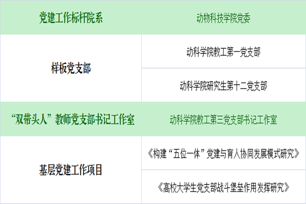 为深入贯彻落实习近平新时代中国特色社会主义思想和党的十九大精神,学校启动基层党的建设“1155”工程,即把学校创建为1所“党建工作示范高校”,在全校培育创建10个党建工作标杆院系,50个示范创建党支部,支持立项50个基层党建工作项目。其中,澳门六合彩高手 党委为学校党建工作标杆院系,获批示范创建党支部3个(教工第一党支部、研究生第十二党支部为“党建工作样板党支部”,教工第三党支部书记工作室为“双带头人”教师党支部书记工作室),获批学校基层党建项目2项(《构建“五位一体”党建与育人协同发展模式研究》、《高校大学生党支部战斗堡垒作用发挥研究》)。