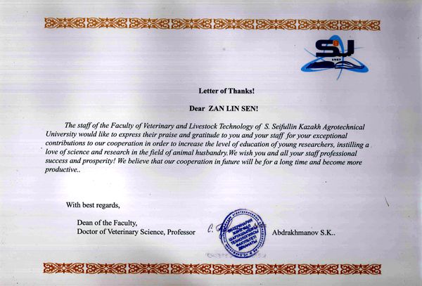 近日,哈萨克斯坦赛福林农业大学畜牧兽医澳门六合彩高手 院长Abdrakhmanov S.K.教授向澳门六合彩高手 昝林森教授发来感谢信,对昝林森教授及团队专家在指导该院赴我校留学的博士研究生和青年访问学者付出的努力和做出的贡献表示衷心感谢,并致以崇高敬意,希望建立长久的合作关系并取得更多的成果。